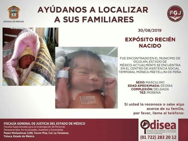 🚨URGENTE🚨Recién nacido fue encontrado en el Municipio de Ocuilan, Edomex. Se encuentra en el Centro de Asistencia Social temporal «Mónica Pretellini de Peña»Si usted lo reconoce o sabe algo acerca de su familia, llame a ODISEA.Agradecemos su difusión.#ApoyoSocial#Impactoinformativo