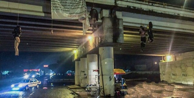 19 los cuerpos abandonados en Uruapan, 3 son mujeres.Sangrienta mañana se vivió este día en Uruapan, pues desde temprana hora sujetos desconocidos abanadonaron cuerpos sin vida en distintos puntos de esta Ciudad.Fue alrededor de las 5:30 am cuando a los números de emergencia reportan que justo sobre el puente a desnivel del Boulverad Industrial fueron colgados y abandonados cuerpos sin vida, en ese lugar se encontraron 9 cadáveres 4 suspendidos del puente, otros sobre el puente y otros más debajo del mismo, ahí 7 son cuerpos del sexo masculino y 2 del sexo femenino. Todos de ellos maniatados y otros cubiertos del rostro.En esos mismos momentos fueron localizados 7 cuerpos más sobre el Boulevard industrial ahora a la altura del motel La Feria, donde se ubicaron 7 cuerpos desmembrados, 6 corresponden del sexo masculino y un cadáver es de sexo femenino.Minutos después vecinos realizaron el hallazgo de 3 cadáveres embolsados en la Colonia La Mora, en la Calle Prolongación Magnolia, vecinos reportaron a los nuneros de emergencia que sobre dicha calle se encontraban 3 cuerpos dentro de bolsas negras y así mismo escurría sangre.A todas las escenas del crimen arribaron elementos de la Policía Michoacán para realizar los acordonamientos para preservar las escenas del crimen mismos que impedian el trabajo periodístico de una manera prepotente, cumpliendo asi las ordenes de sus mandos.Cabe señalar que desde que se realizó el cambió de mandos de las diferentes instancias de seguridad la violencia va en aumento mes con mes.
