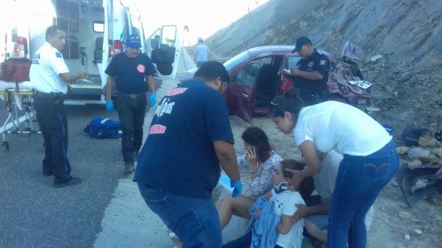 Todos Santos (Baja California Sur).- Las corporaciones de seguridad de esta comunidad, se movilizaron al kilómetro 36 de la carretera a La Paz poco antes de las seis de la tarde de ayer domingo, ya que les informaban de un choque y volcadura con saldo de personas lesionadas.Al llegar al sitio, observaron el vehículo Nissan Versa de color guinda con daños visibles en su carrocería además de un oficial de la Policía Federal que daba asistencia a las personas que iban a bordo de la unidad siniestrada.Se trata de una mujer de nombre Samantha «N», quien iba acompañada de su pequeña hija de 8 años de edad rumbo a Cabo San Lucas, cuando de repente perdió el control del carro.Paramédicos del heróico Cuerpo de Bomberos de Todos Santos trasladaron a la clínica de Salud a la pequeña quien aparentemente no mostraba alguna lesión de consideración, sin embargo decidieron llevarla para una valoración física más a fondo.Policía Federal de hizo cargo del peritaje. El vehículo pertence a la arrendadora Thrifty.