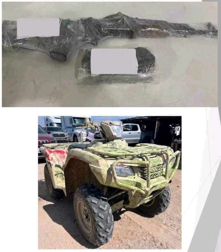 También en Sonoyta, en las inmediaciones del Ejido #ELDESIERTO confiscaron una motocicleta tipo cuatrimoto modelo 2024, en donde se encontró un arma de fuego tipo fusil; un cargador para arma de fuego y 30 cartuchos calibre 7.62 x 39 mm.